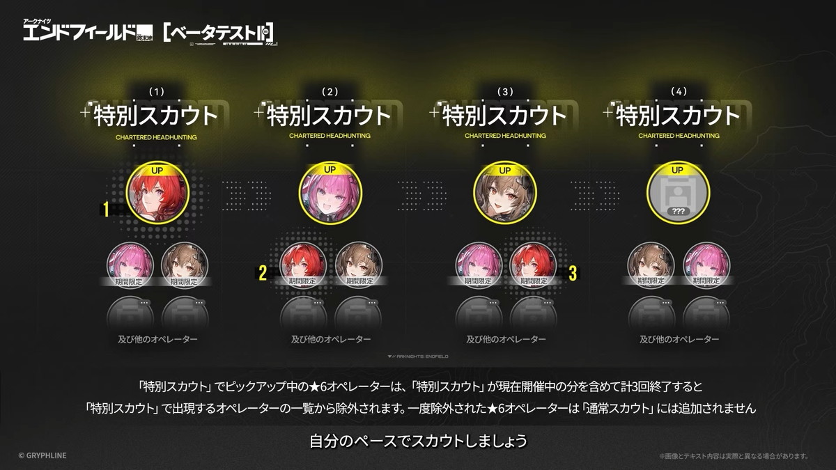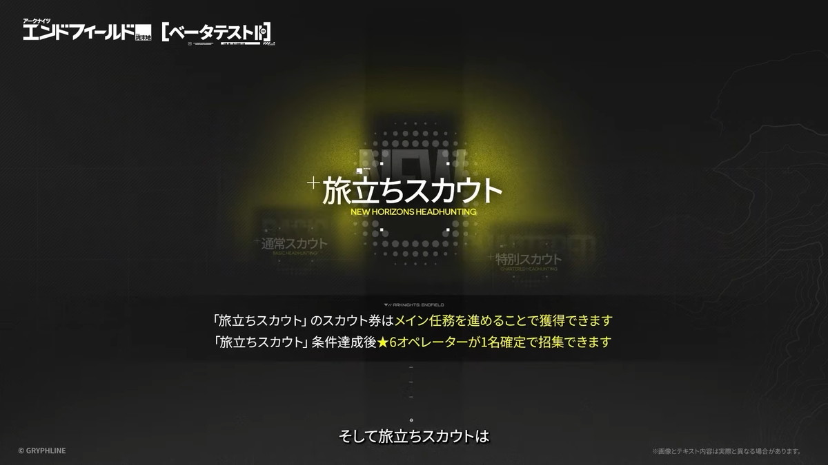 旅立ちスカウトはいわゆる初心者ガチャで条件達成をすれば★6オペレーターが1名確定で招集できる。通常スカウトは常設ガチャ、特別スカウトは★6オペレーターのピックアップガチャのこと。