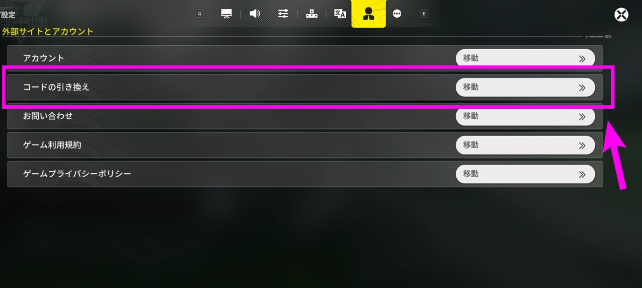 ゲーム内で【協約同期装置(メニュー)】→【設定】を開き、【外部サイトとアカウント】タブにある「コードの引き換え」を選択する。