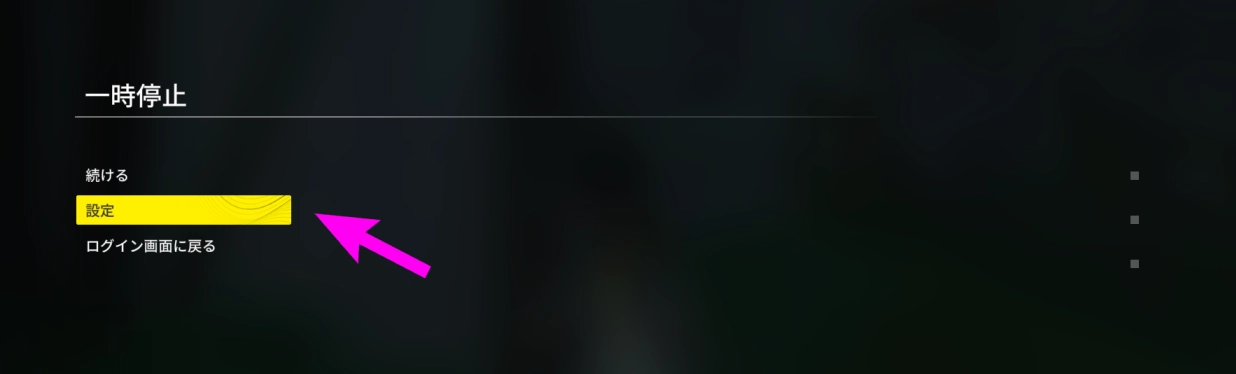 【一時停止メニュー】→【設定】と進み、後は先ほどと同じ手順を踏む。