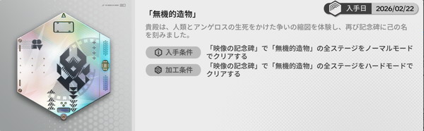 ノーマルモードの全ステージをクリアすると勲章「無機的造物」を獲得、ハードモードの全ステージをクリアすると勲章を加工することができる。