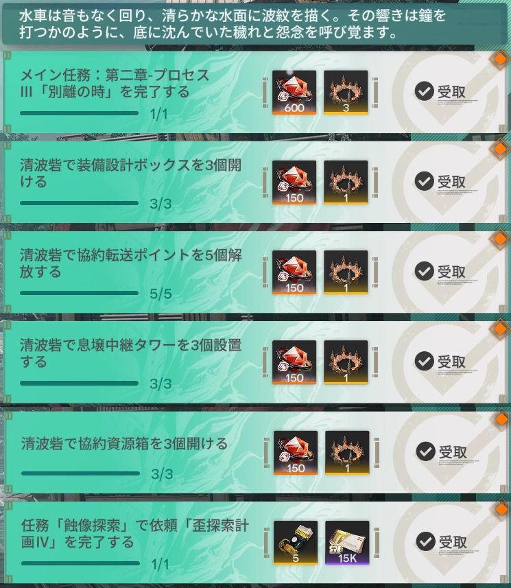任務はすべてバージョン「潮起ち、故淵離る」(2026/03/12~)で追加されたコンテンツ内容に関わるものとなっている。