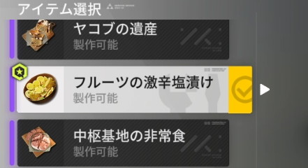 「フルーツの激辛塩漬け」のレシピが未入手の場合は、苦葉椒を手に入れた段階で製作手帳から入手可能。