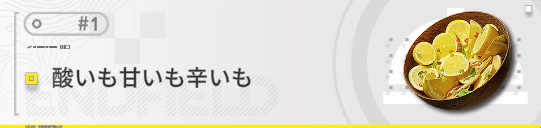 | 辛くて酸っぱい味に高能異香石の独特な香りが広がる。初めてこの料理を食べたとき、その濃厚な香りに引きつけられた。一口食べれば「酸味と辛味の両極端」という忘れがたい究極の体験ができるだろう。 フルーツの激辛塩漬けをブゴールに分けてやった。開拓祭がやって来るたび、彼は一番よくそれを食べていた。残りは2人の仲間に分けたが、そろって辛さの後に甘味が広がる爽やかな味わいに感動していた。 |