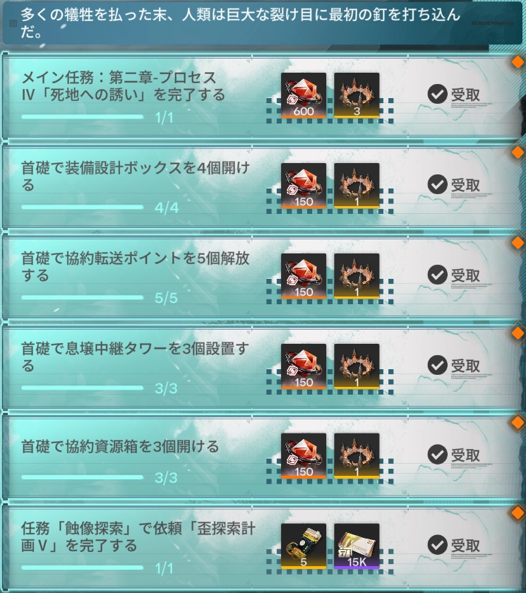 すべての任務を達成すると赤晶玉×1200と存続の痕跡×7、さらに上級認識媒体×5、折金券×15000が手に入る。