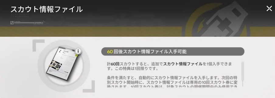 特別スカウトを計60回行うと「スカウト情報ファイル」というアイテムが手に入る。
