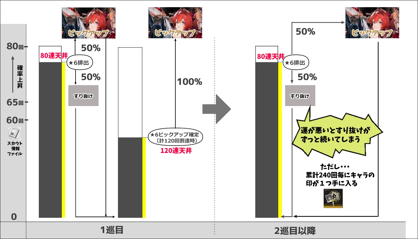 1巡目は★6限定オペレーターの確定枠があるが、2巡目以降は不運が続くとすり抜けを引き続ける可能性があるということになる。