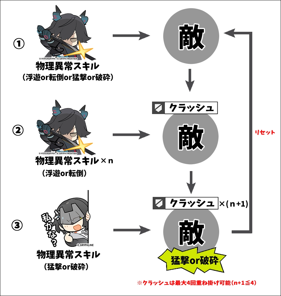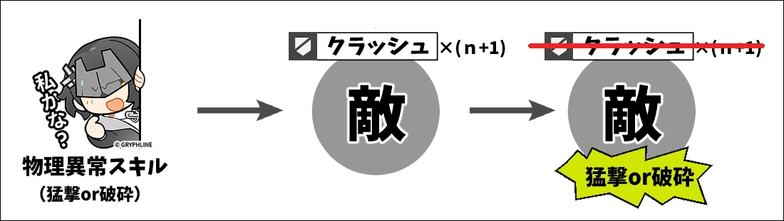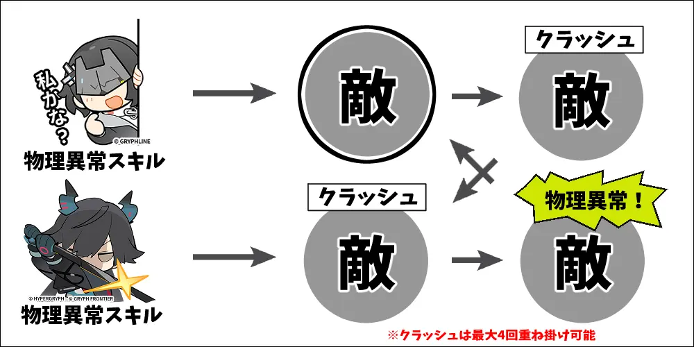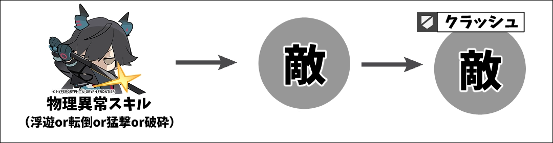 はじめに物理異常の効果を持つスキル(浮遊・転倒・猛撃・破砕)がデフォルト状態の敵に当たる(*3)と、異常効果は発動せずに敵はクラッシュ状態となる。