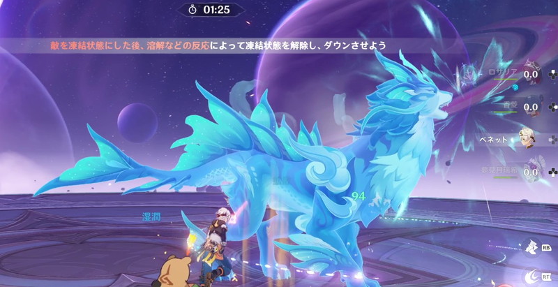 猊獣が真っ青になって「敵を凍結状態にした後~」の説明文が出たら氷元素を当てて凍結させよう。