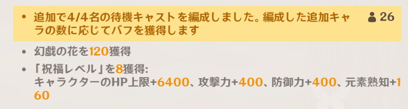 編成したキャラの数に応じてバフがかかる仕組みなので、育ってないからと編成キャラを減らすのは得策ではない。